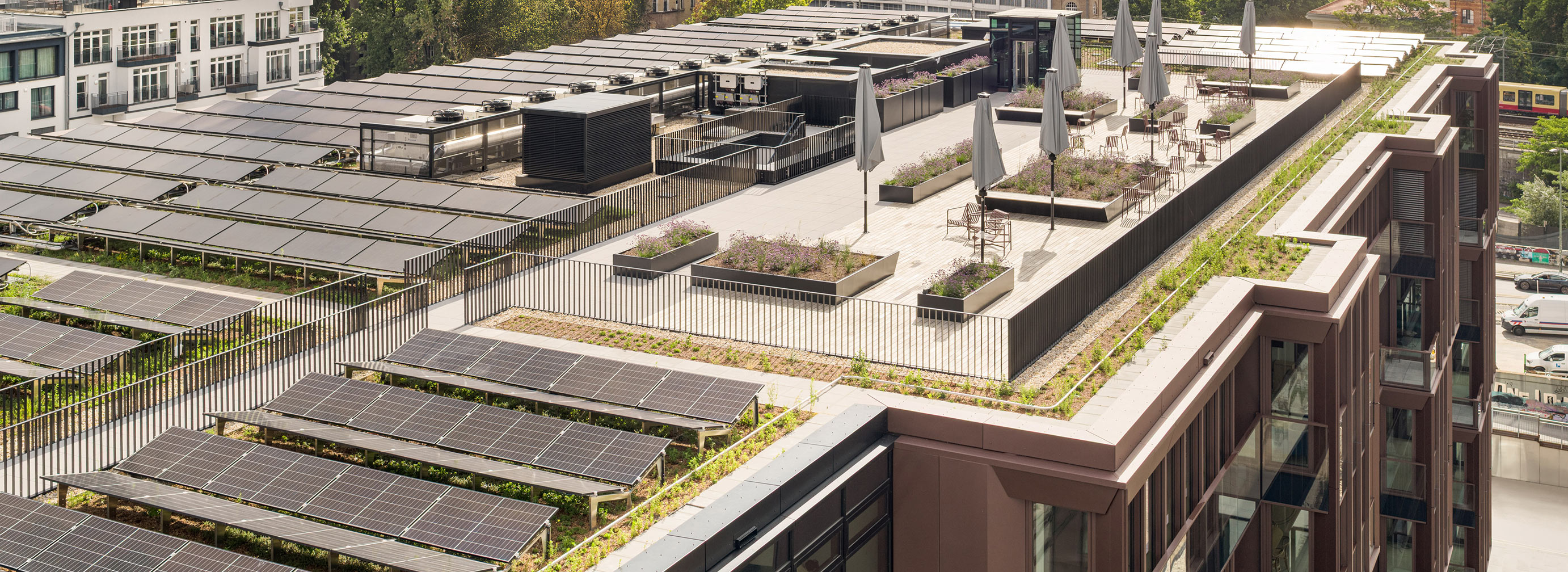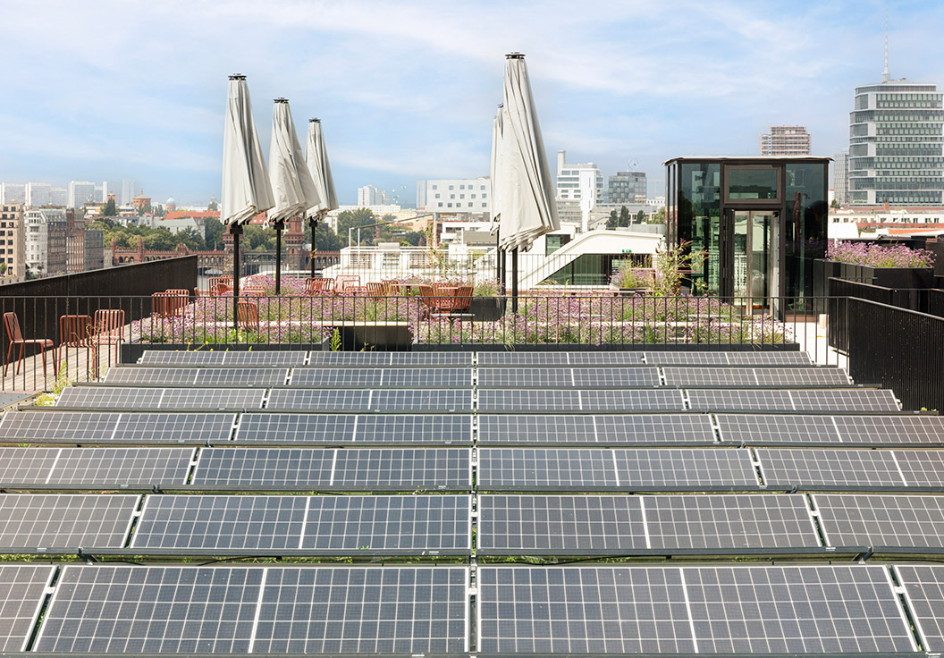 Geothermie, Sonne und Umgebungsluft. Über sogenannte Wärmepumpen wird die jeweils CO₂-frei bereitgestellte Energie genutzt, um das Gebäude je nach Bedarf zu heizen oder zu kühlen. Die Solarthermie-Kollektoren jüngster Generation erzeugen neben Wärme zusätzlich auch Strom für den Betrieb der Wärmepumpen. Reicht dieser Strom nicht aus, wird zusätzlich Elektrizität aus erneuerbaren Quellen eingekauft.