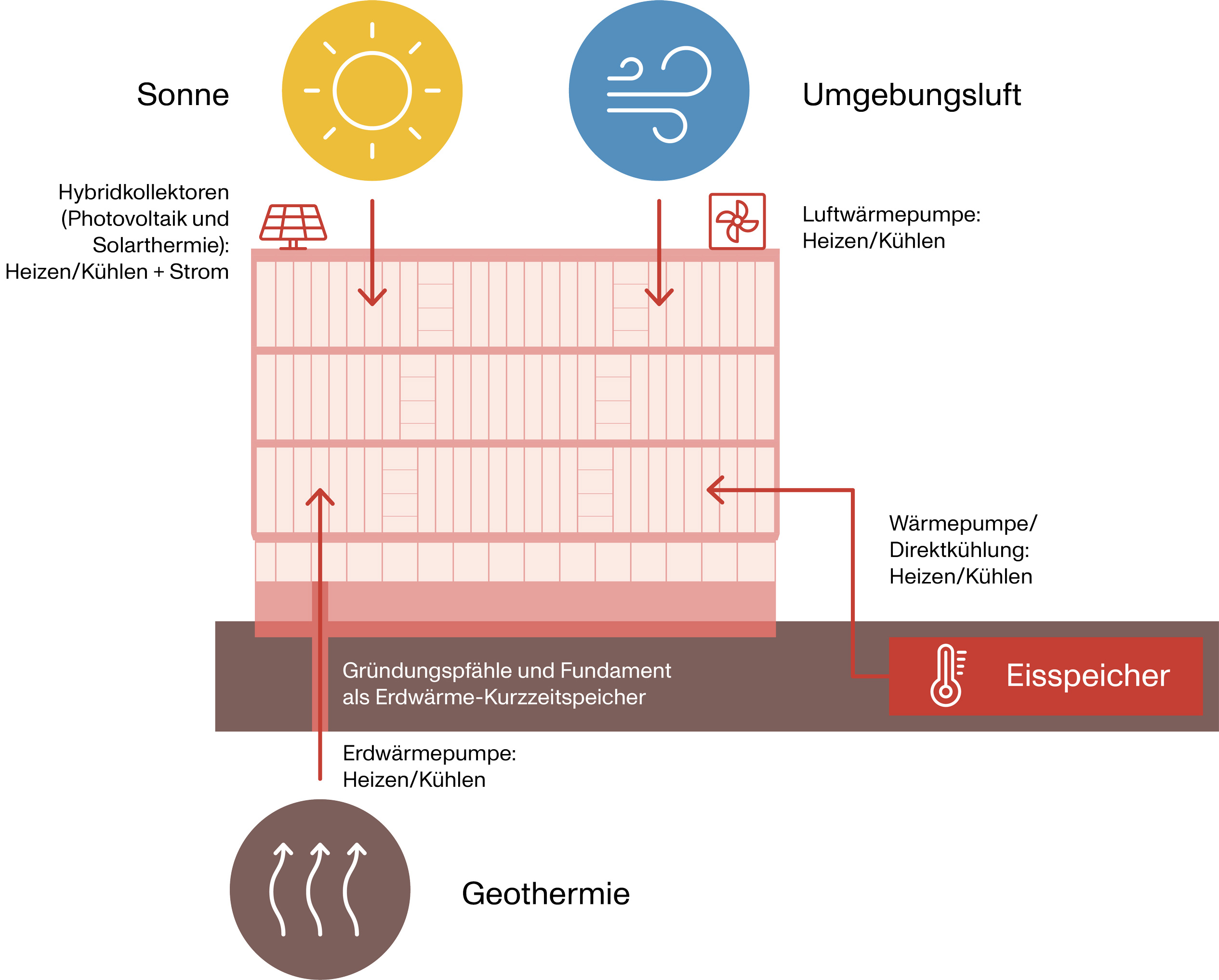 Geothermie, Sonne und Umgebungsluft. Über sogenannte Wärmepumpen wird die jeweils CO₂-frei bereitgestellte Energie genutzt, um das Gebäude je nach Bedarf zu heizen oder zu kühlen. Die Solarthermie-Kollektoren jüngster Generation erzeugen neben Wärme zusätzlich auch Strom für den Betrieb der Wärmepumpen. Reicht dieser Strom nicht aus, wird zusätzlich Elektrizität aus erneuerbaren Quellen eingekauft.
