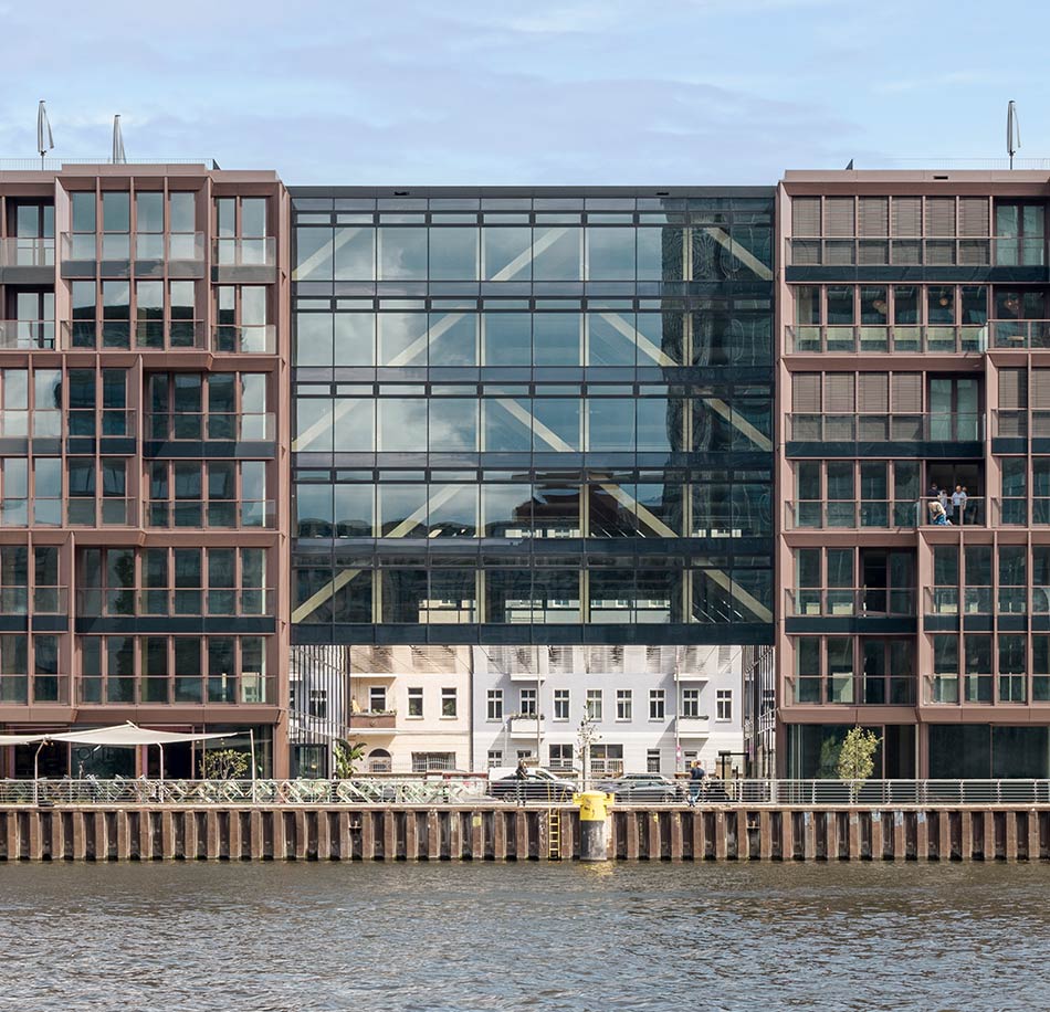 Hafenatmosphäre, die inspiriert. Die sogenannte Mediaspree entlang des Osthafens ist einer der gefragtesten Bürostandorte Berlins in der Technologie-, Medien- und Telekommunikationsbranche. Unternehmen, Mitarbeiter*innen und Kund*innen schätzen den Charme der Wasserlage genauso wie das kontrastreiche Zusammenspiel der historischen Speicher- und Lagerhäuser mit den modernen Wohn- und Bürogebäuden.