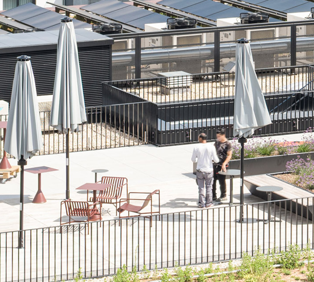 Das Rooftop als Community-Bereich mit Angeboten für Drinks, Snacks und Sport.
